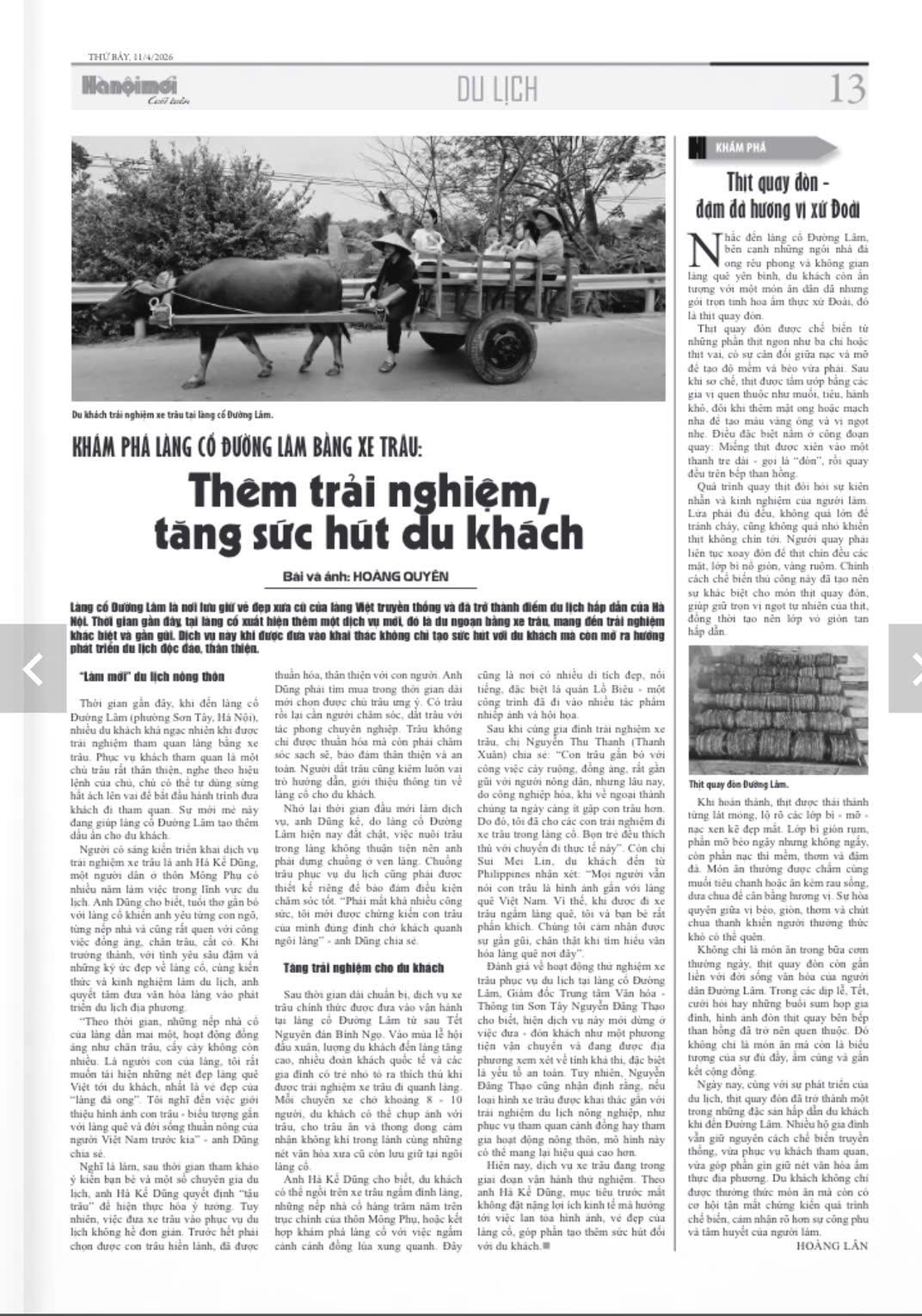 Commenting on the trial operation of ox carts for tourism in Duong Lam ancient village, Nguyen Dang Thao, Director of the Son Tay Cultural and Information Center, said that currently, this service is limited to transporting tourists as a means of transportation and is being considered by the local authorities regarding its feasibility, especially safety. However, Mr. Nguyen Dang Thao also noted that if ox carts were developed in conjunction with agricultural tourism experiences, such as serving tours of rice fields or participation in rural activities, this model could be more effective.